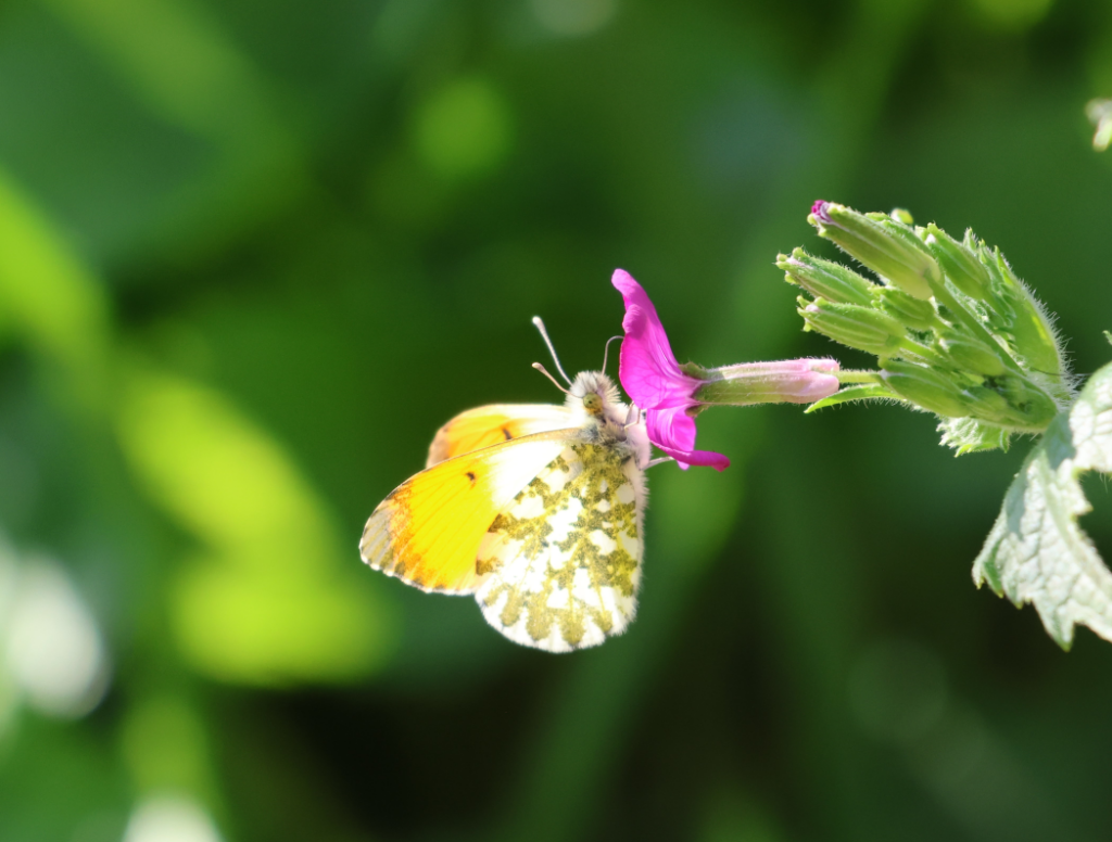 - autour du 21, quelques lépidoptères montrent le bout de leurs antennes à l’instar de anthocharis cardamines, alias l’Aurore. Littéralement » grâce des fleurs », ce petit papillon ne manque pas de légèreté en effet. Plus enclin à fréquenter la famille des crucifères, le mâle n’a ici de trompe que pour les inflorescences de la monnaie du pape. Dans quelques mois, cette lunaire arborera à la fructification des siliques nacrées renfermant les fameuses pièces de monnaie qui feront le bonheur des jardiniers.