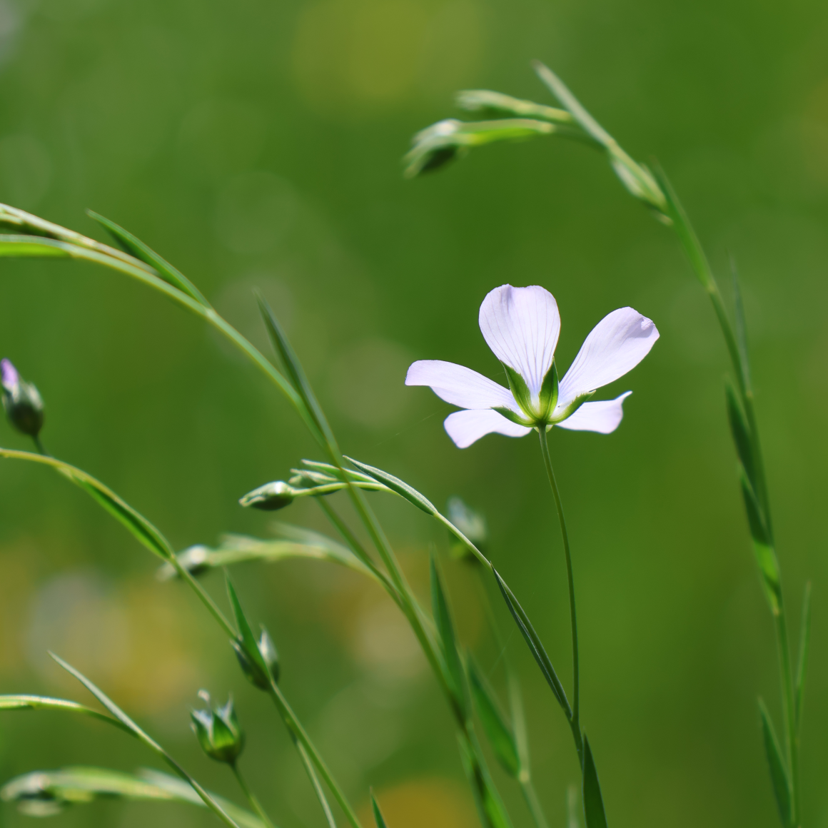 - Le lin bienne (linum bienne) à feuilles étroites, fleurit en plein soleil. Il échelonne sa délicate floraison -une ou deux fleurs ouvertes par jour, rarement 3, selon une technique bien rodée. Chaque fleur ne dure qu’une moitié de journée, mais une autre est prête à s’ouvrir dès le lendemain matin, et ainsi de suite, contentant les pollinisateurs qui n’y voient que du feu.