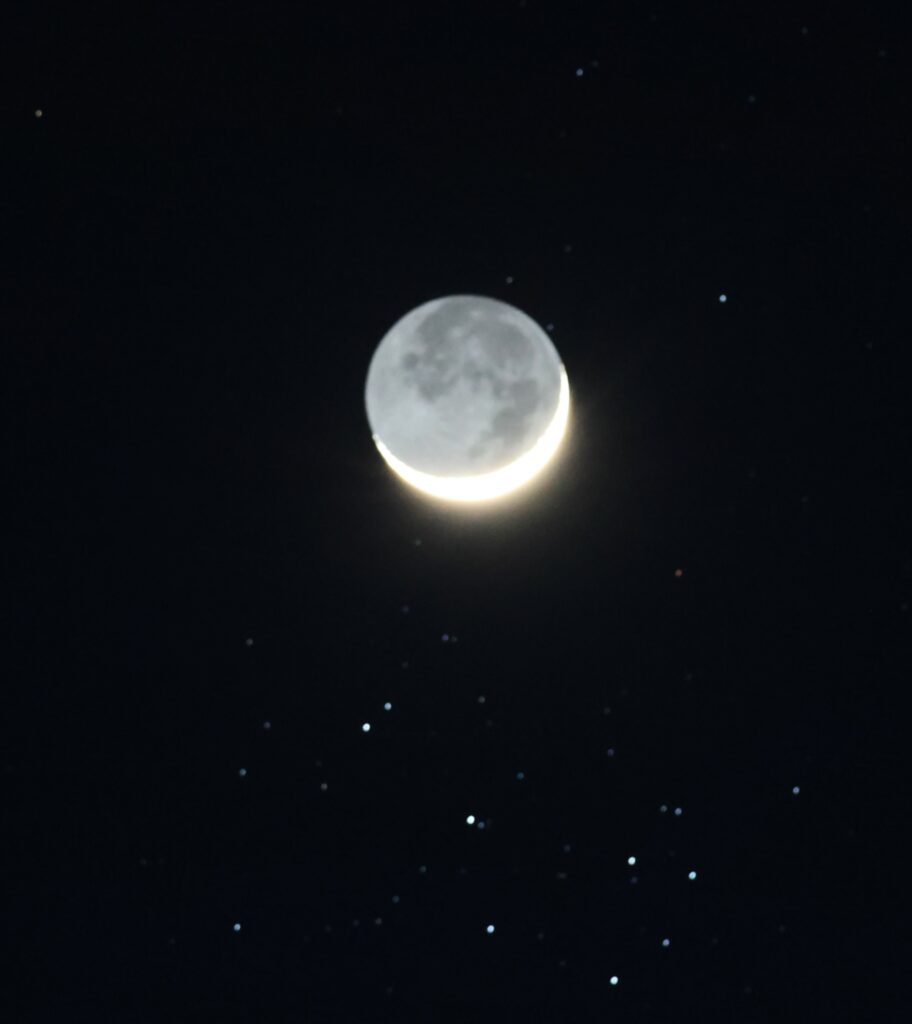 - Le 19, le crépuscule nous donne à contempler la Lune en lumière cendrée « à proximité apparente » de la constellation des Pléïades ».