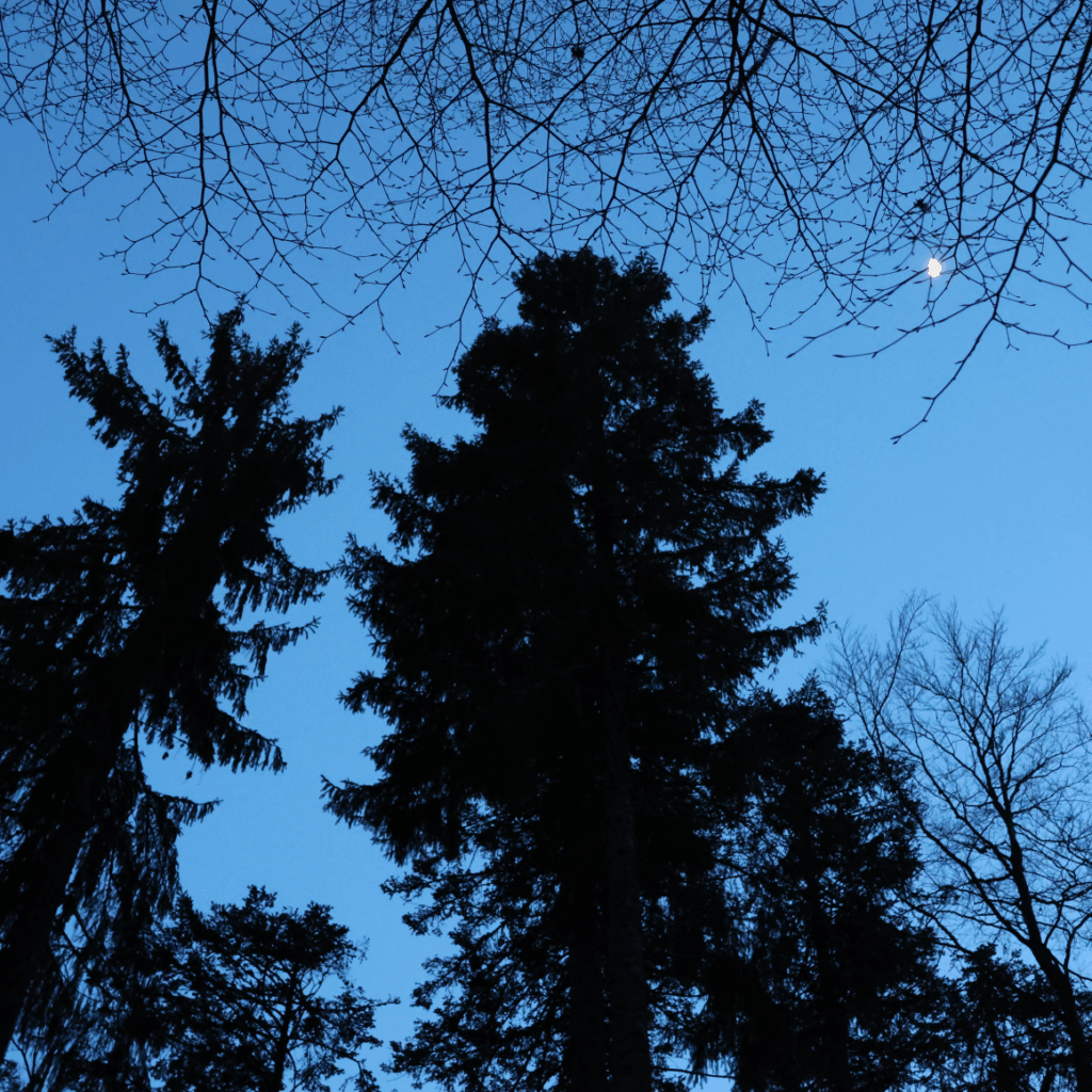 Ensuite leurs voix mêlées diminuant d’intensité, nous pouvions les distinguer individuellement ; quelques minutes plus tard l’extinction des feux sonores se produisit à la nuit tombée. Pourtant on pouvait encore entendre ici ou là quelques grincheux qui se poussaient à qui mieux mieux. N’ayant trouvé place libre, certains oiseaux consentaient à descendre à mi-hauteur sur une branche inoccupée d’un grand sapin.
