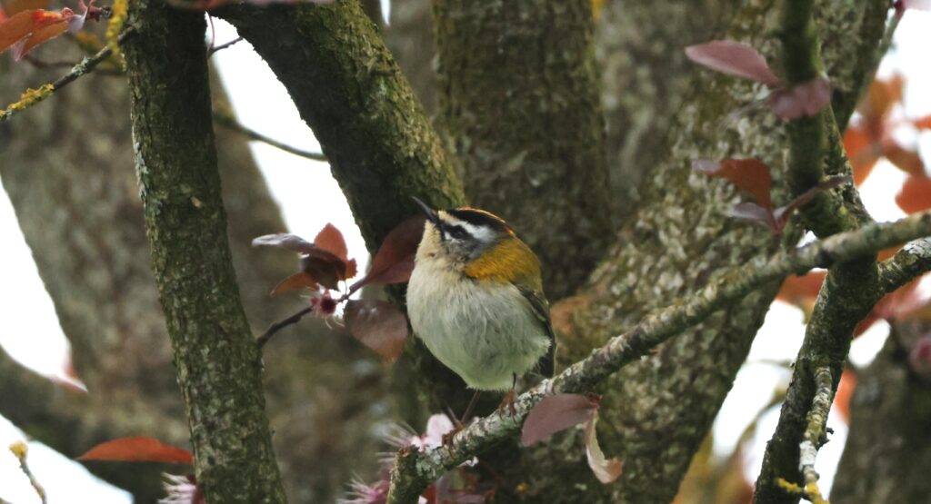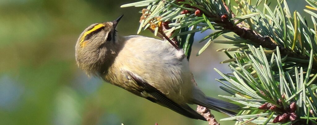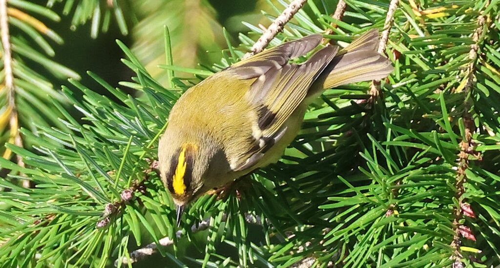 Etre ainsi attentionné à chacune des parcelles de son territoire arboré, est la preuve d’un souverain soucieux d’être au plus près de ses administrés, auxquels il prélève, il faut bien vivre, quelques menus tributs. Parmi les mets au menu du roitelet qu’il soit huppé ou à triple bandeau, on relève toutes sortes d’insectes ailés, plus minuscules les uns que les autres, qu’il capture dans les ramilles une à une explorées.